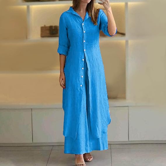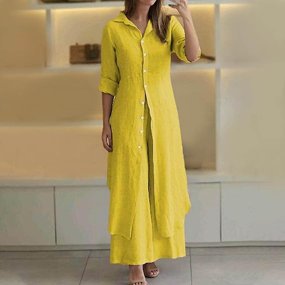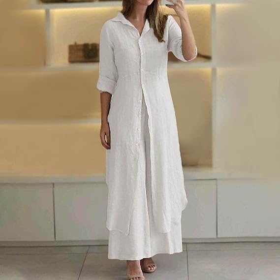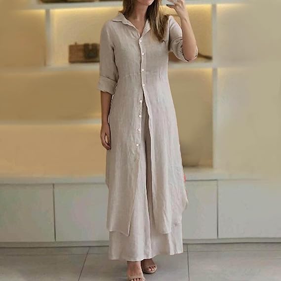 The shirt dress is finished with a classic collar, button fastening, and three-quarter sleeves. The trousers fall loosely around the body and offer ultimate comfort thanks to their straight, flowing legs.