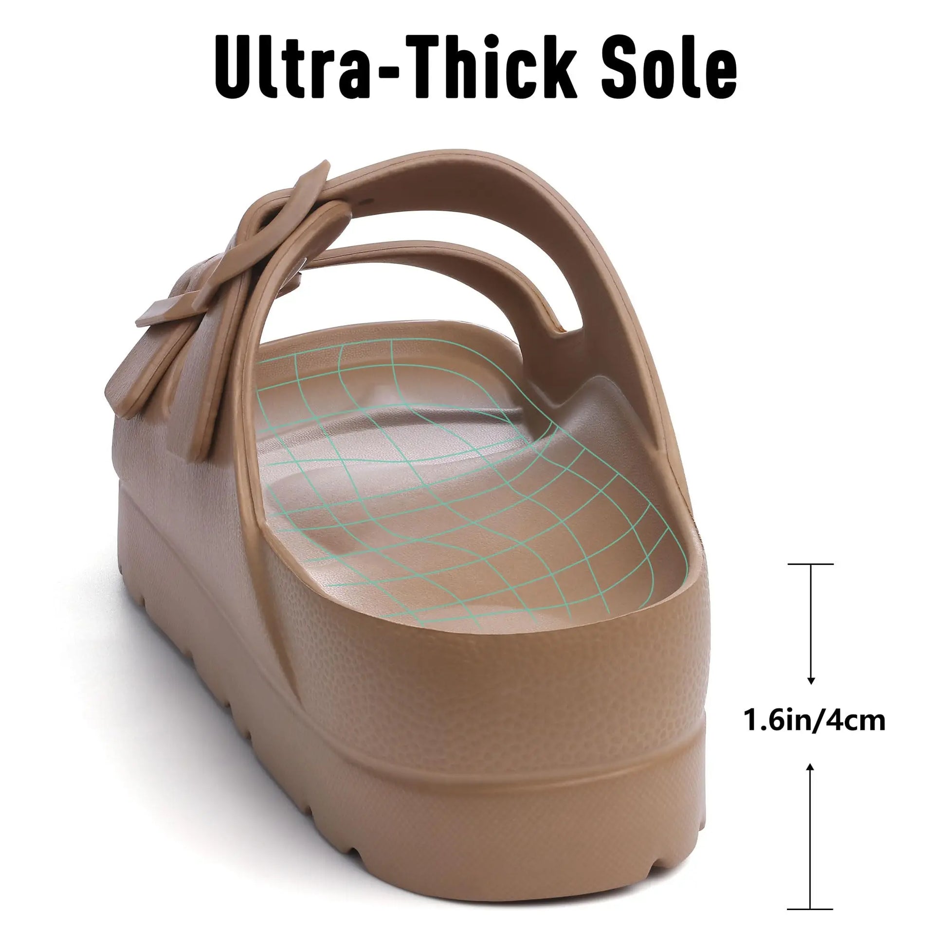 These easy-to-wear slides feature two wide top straps, each with an adjustable buckle for a secure and flexible fit. The open-toe design and contoured footbed offer everyday comfort. A thick, treaded platform sole adds durability and gentle lift, making these sandals a perfect go-to for relaxed style and support.