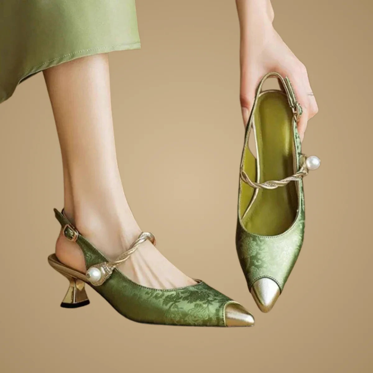 These heels feature a pointed toe with a metallic cap and a twisted strap detail for standout sophistication. The sculpted flared heel adds modern shape and stability, while the slingback design ensures a secure, adjustable fit. A pearl accent brings extra charm, perfect for dressy occasions or elevated daywear.